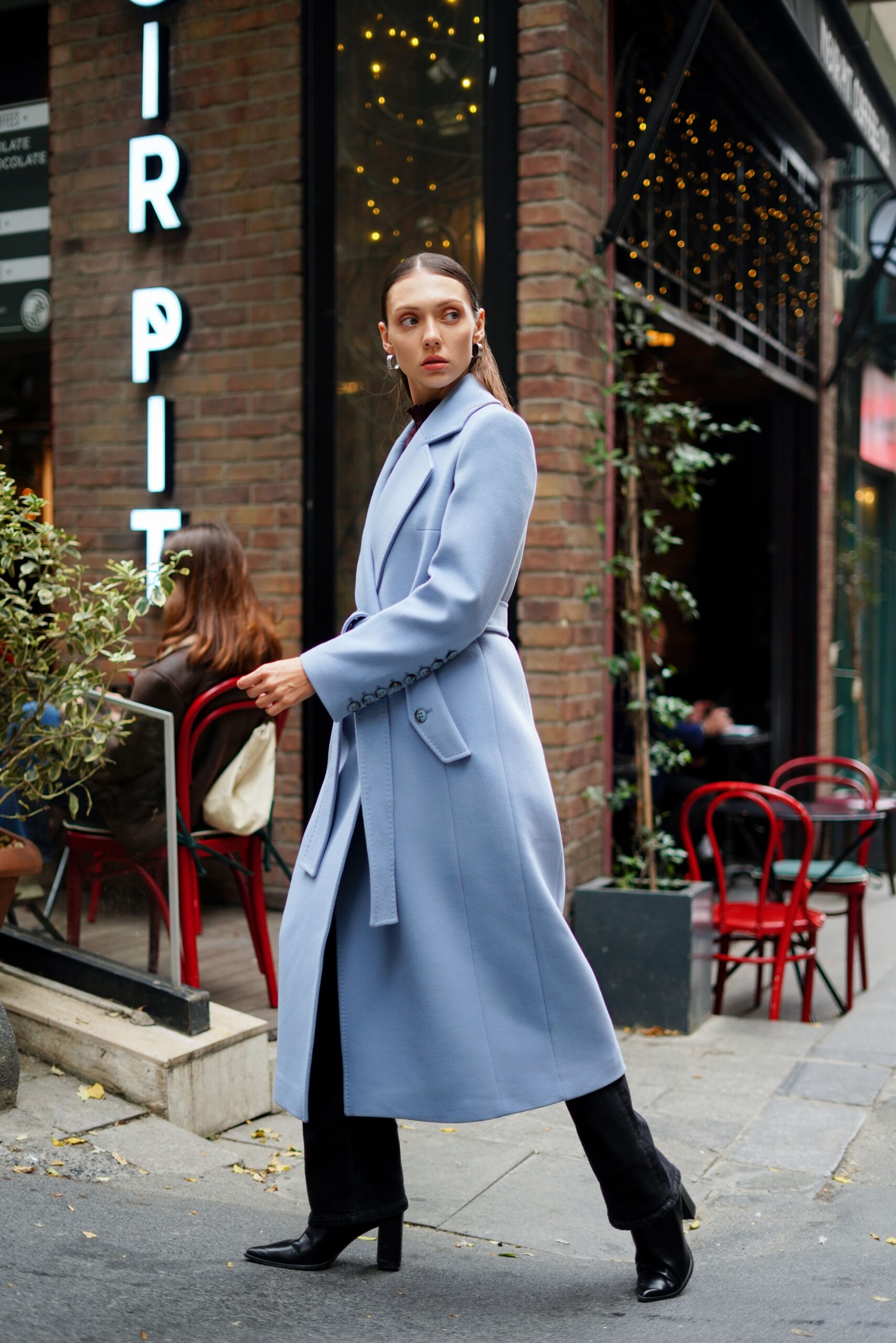 معطف طويل بحزام مصنوع من قماش الكشمير 100%. يوفر مظهراً أنيقاً وقوياً وعصرياً بلونه الأزرق البارد.