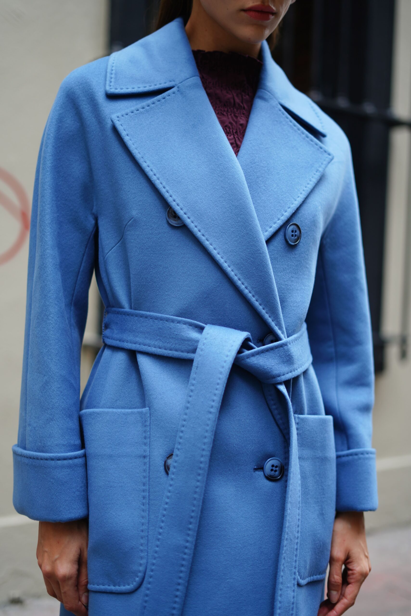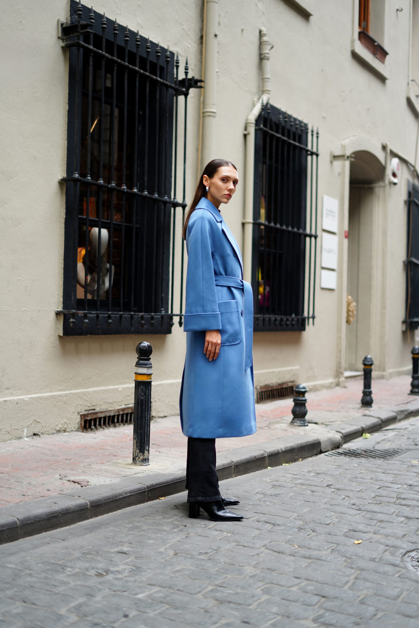 معطف طويل بحزام مصنوع من قماش الكشمير 100%. يقدم مظهراً عصرياً، منعشاً، ومميزاً بفضل درجة لونه الأزرق الثلجي. بطانة الحرير تضمن الأناقة والراحة في آن واحد. لقد تم تصميمه لإطلالة أنيقة ومميزة خلال موسم الشتاء.