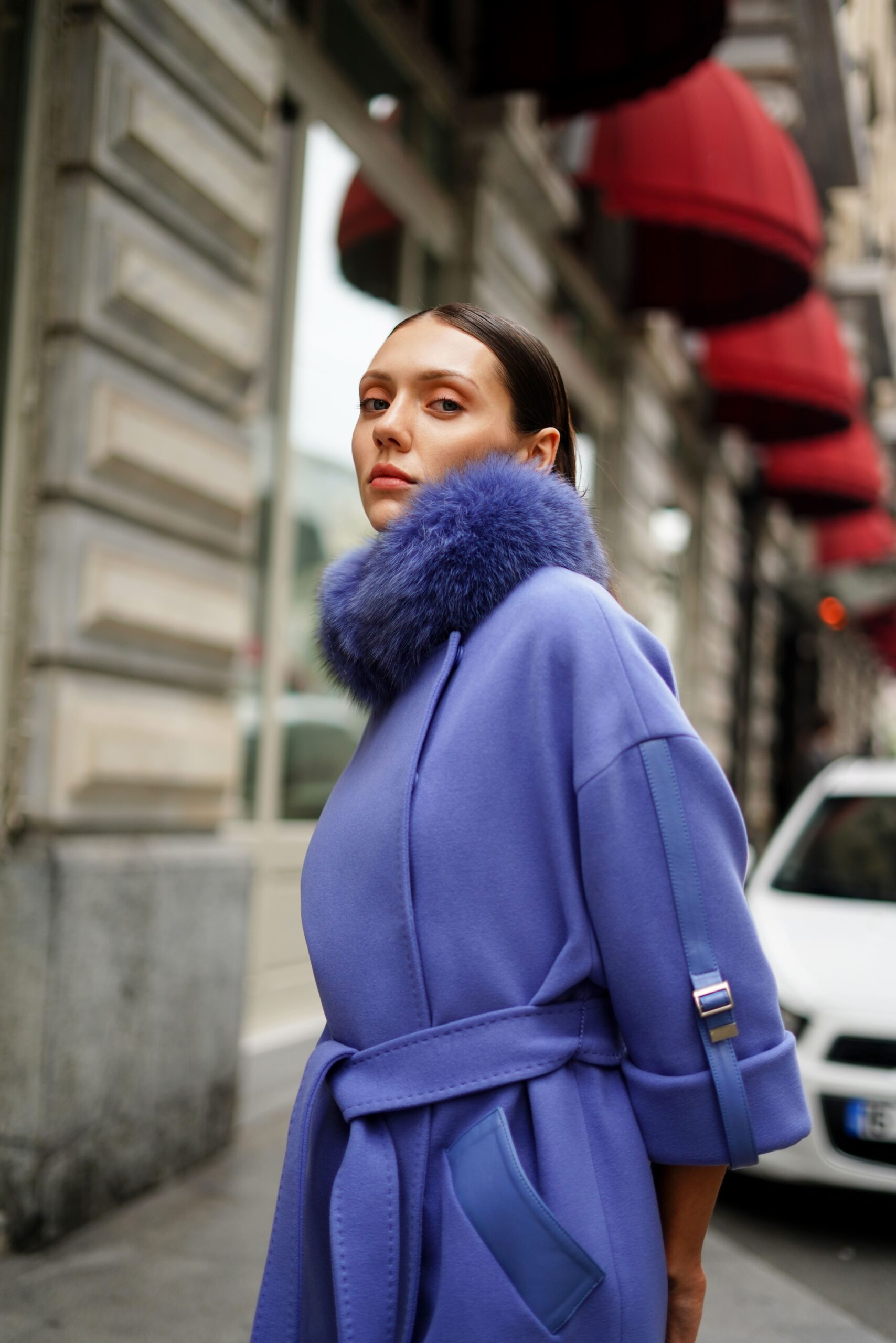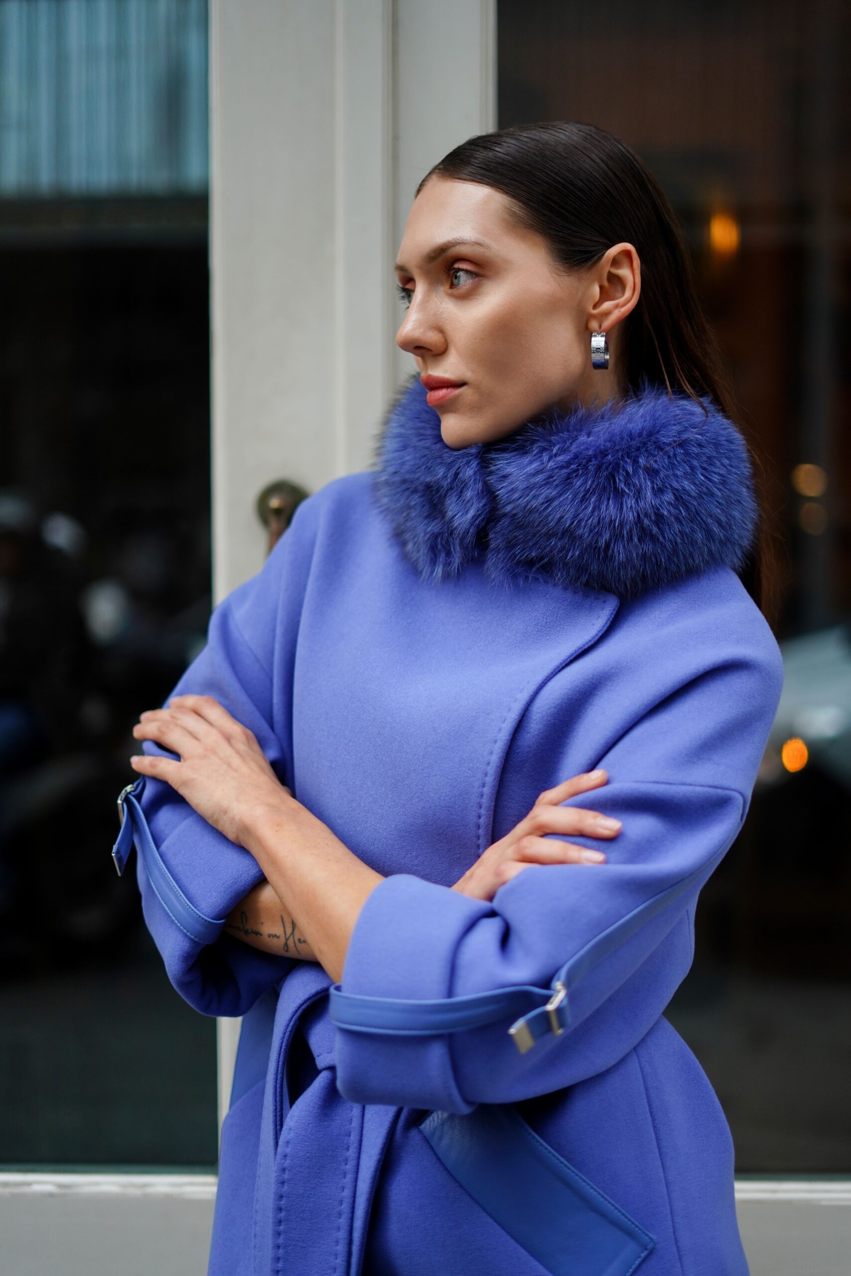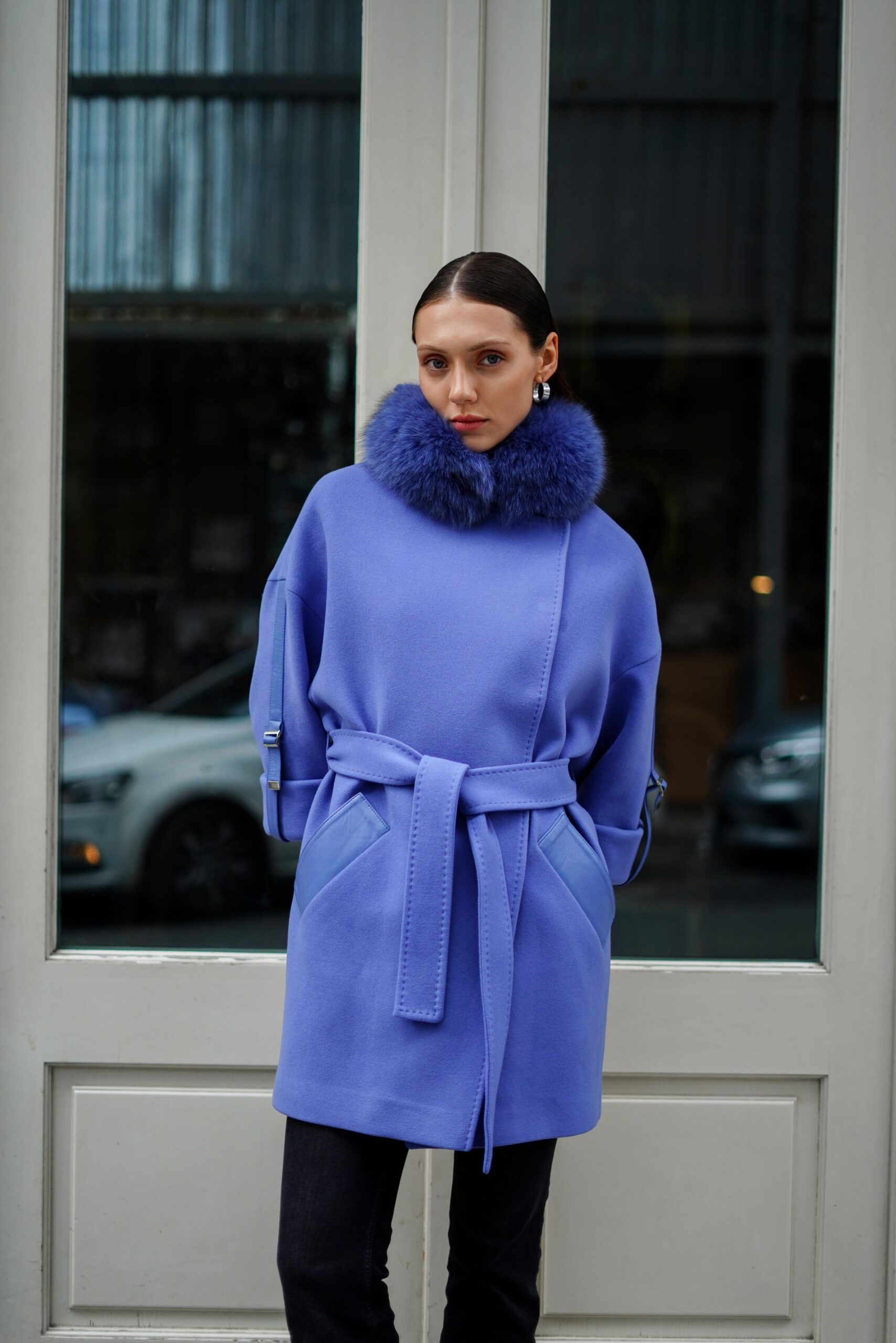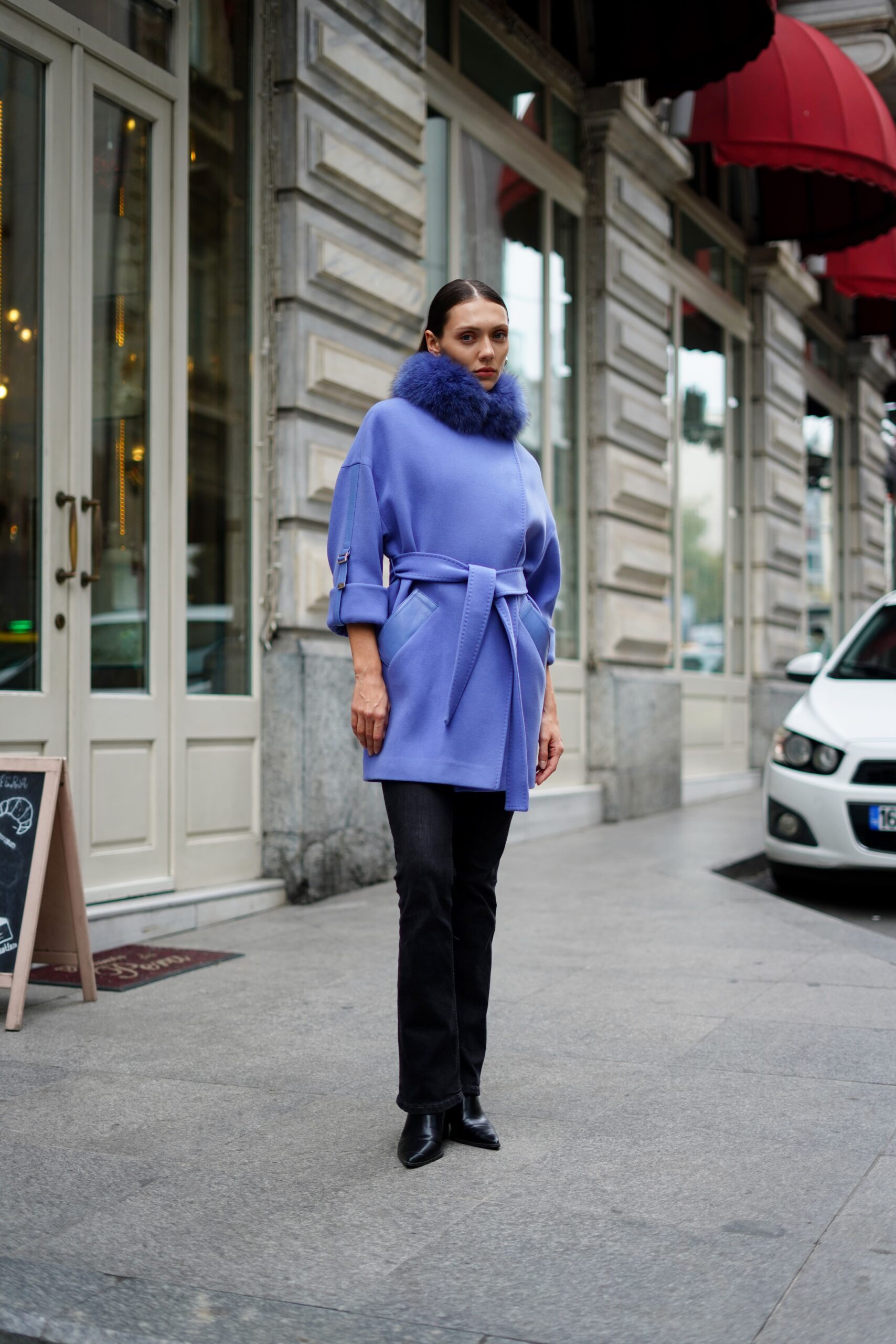معطف قصير بحزام مصنوع من قماش الكشمير 100%. يقدم وقفة قوية بلونه الأزرق الملكي، بينما يبرز الفخامة بياقته المصنوعة من الفرو الطبيعي.