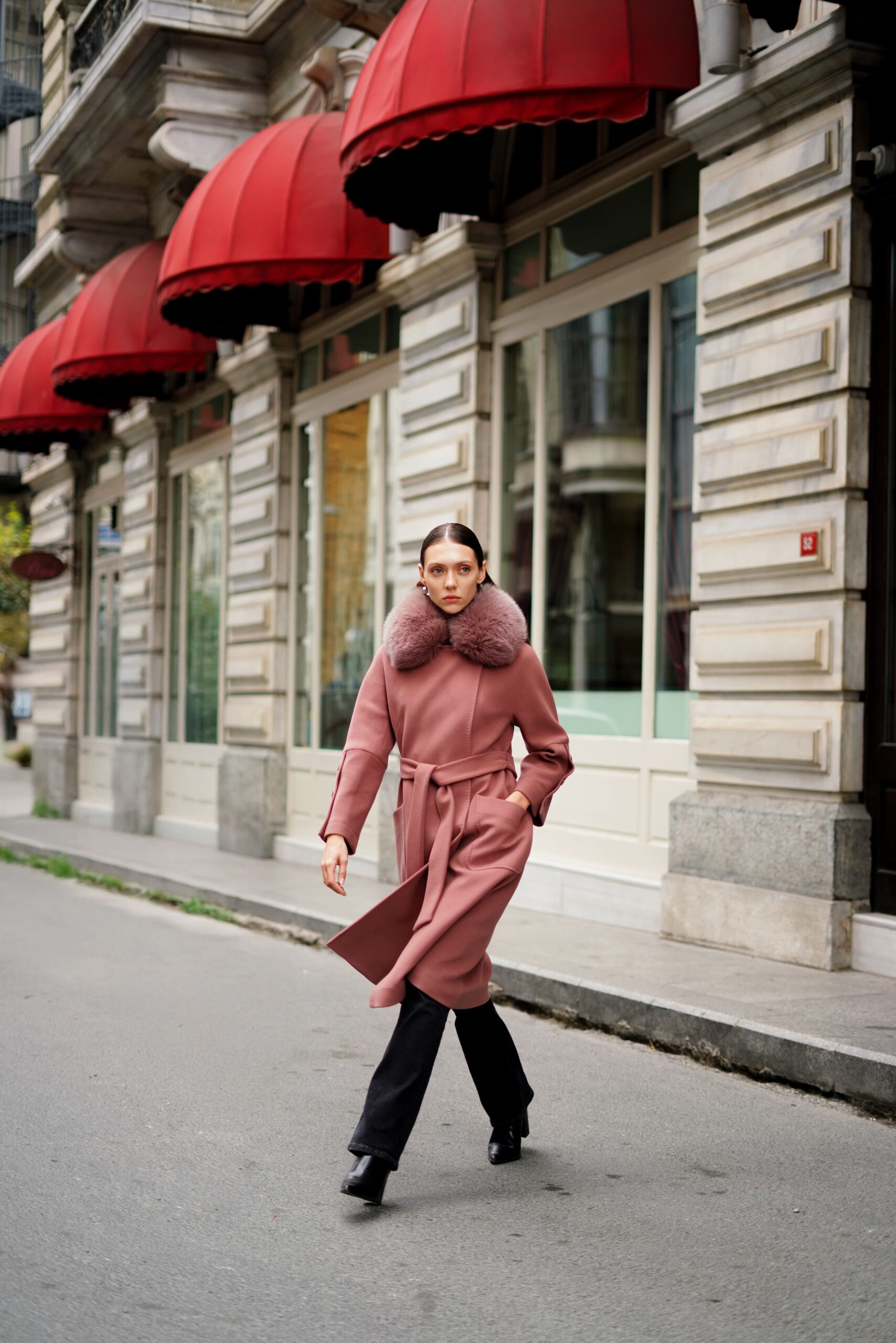 معطف Jadem Cashmere يلفت الأنظار بأناقة التصميم الراقية في شوارع المدينة. لونه الوردي المجفف، وياقته من الفرو الطبيعي، وقصته الطويلة ذات الحزام، تعيد تعريف الرفاهية العصرية. بفضل الملمس الناعم للكشمير والقالب المُفصَّل خصيصًا، يمنحك المعطف مظهراً دافئاً ونبيلاً في نفس الوقت.