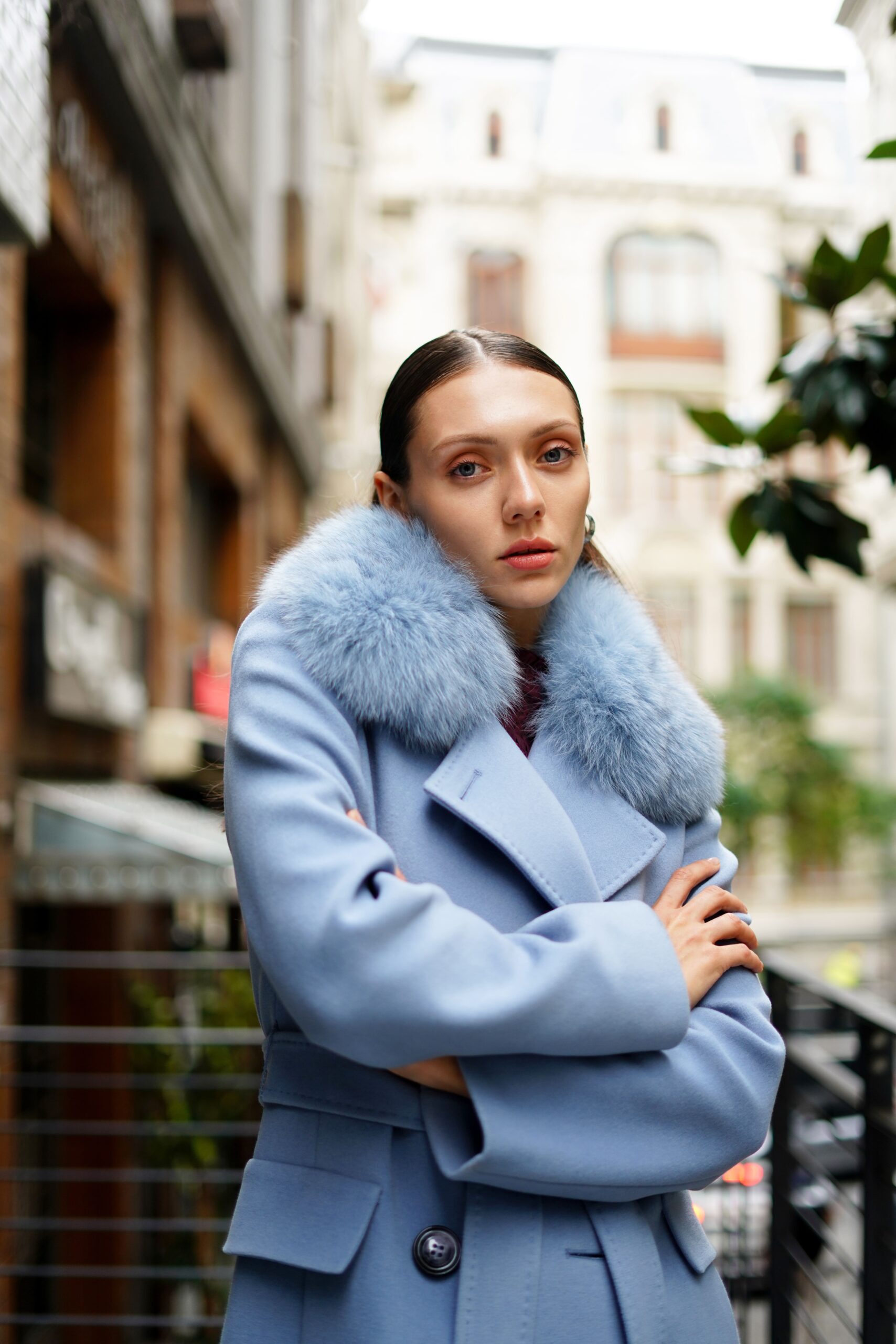 معطف Moda Labella – ياقة من الفرو باللون الأزرق الجليدي