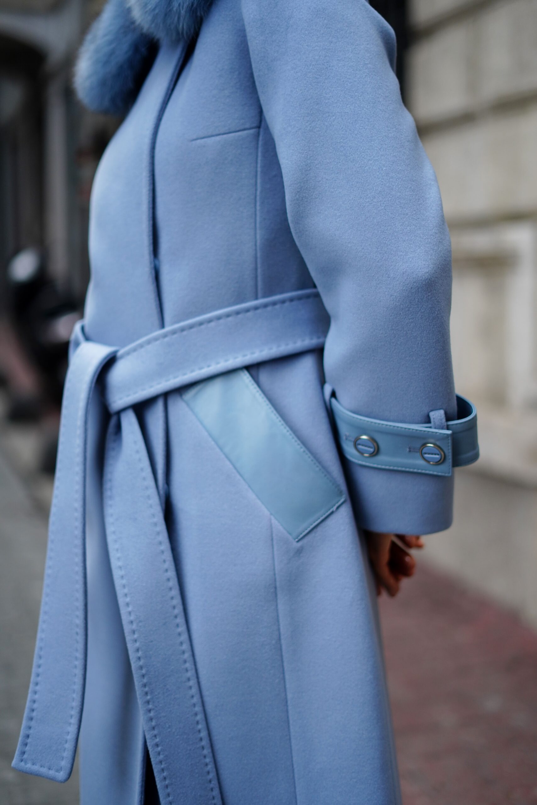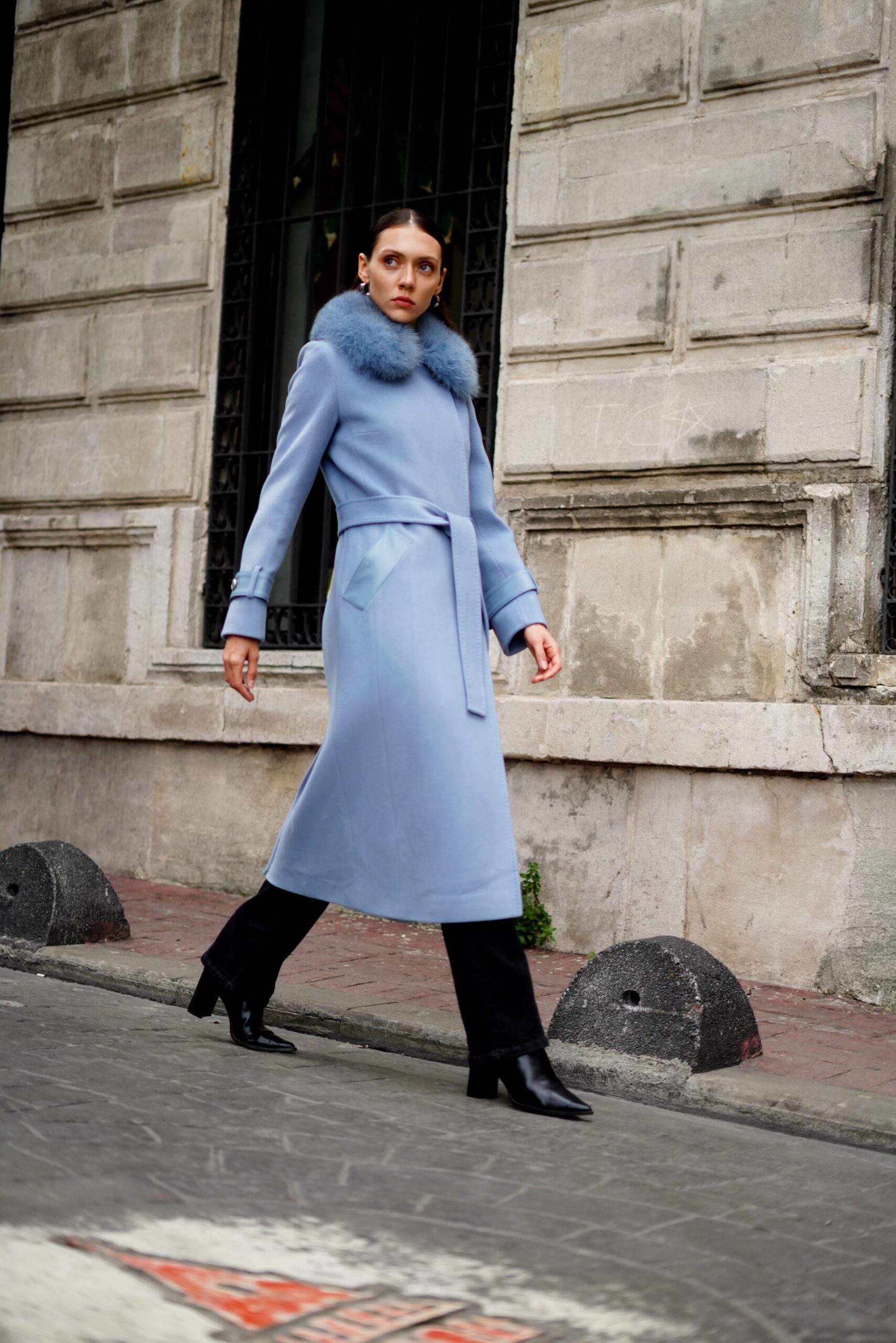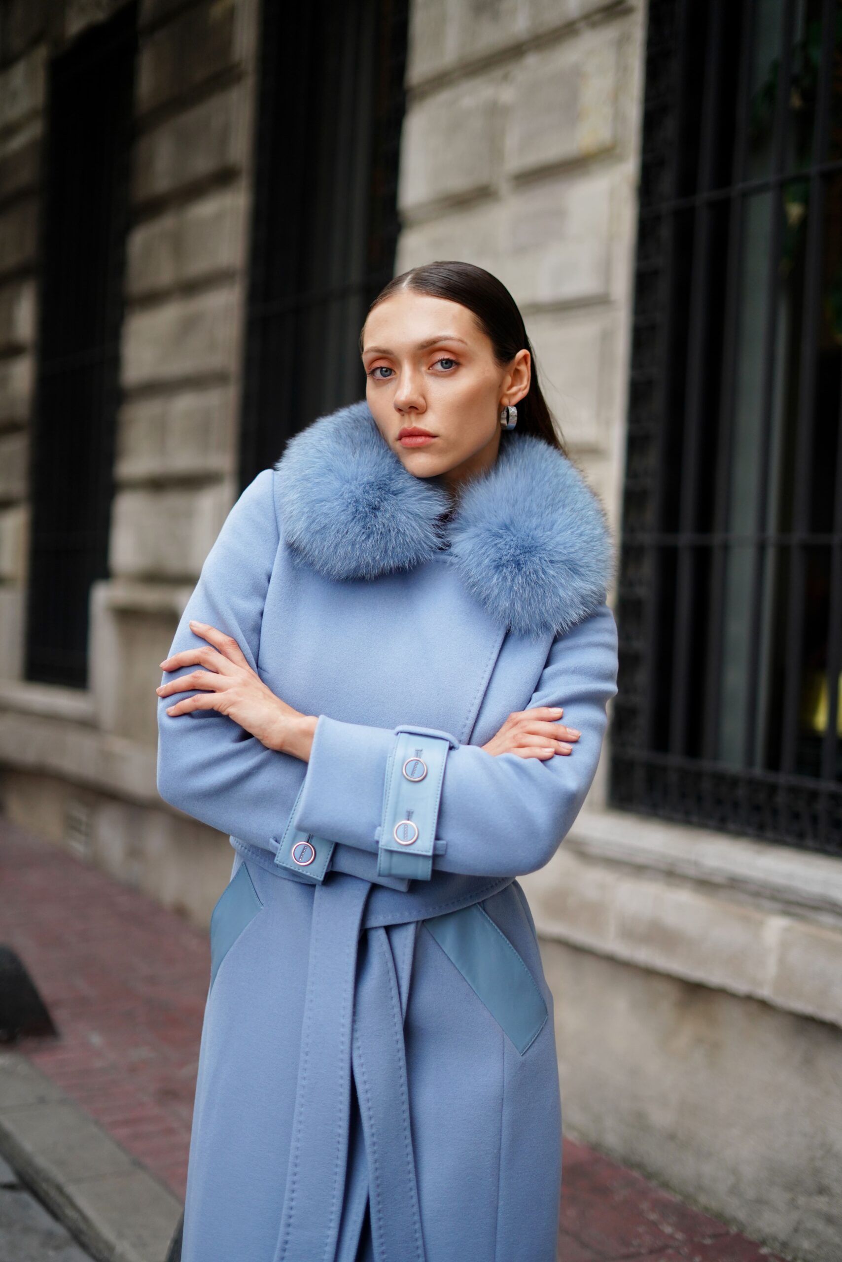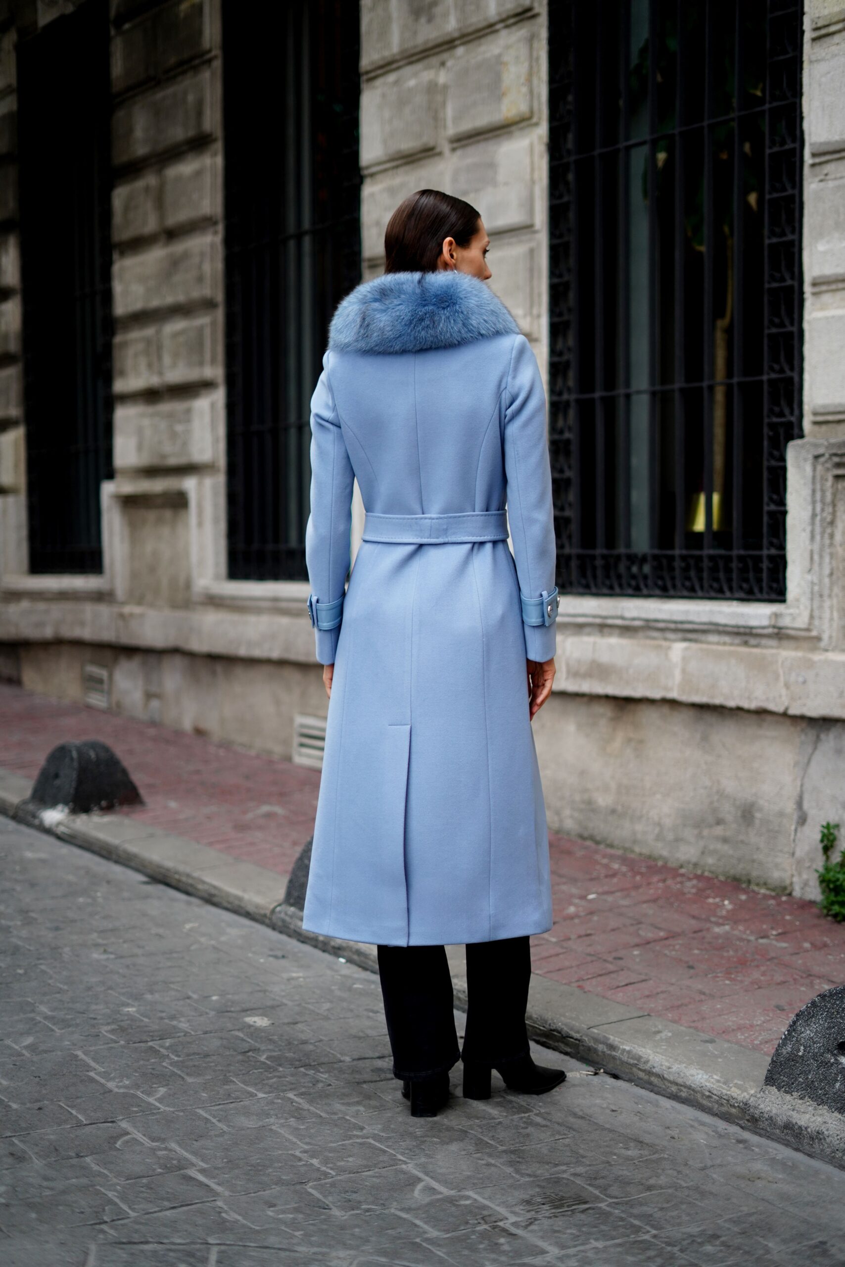 معطف كشمير طويل بحزام يقدم أسلوبًا خالدًا بخطوط أنيقة. يوفر لونه الأزرق الثلجي مظهرًا راقيًا، بينما تضيف ياقته المصنوعة من الفرو الطبيعي لمسة لا تشوبها شائبة من الفخامة.
