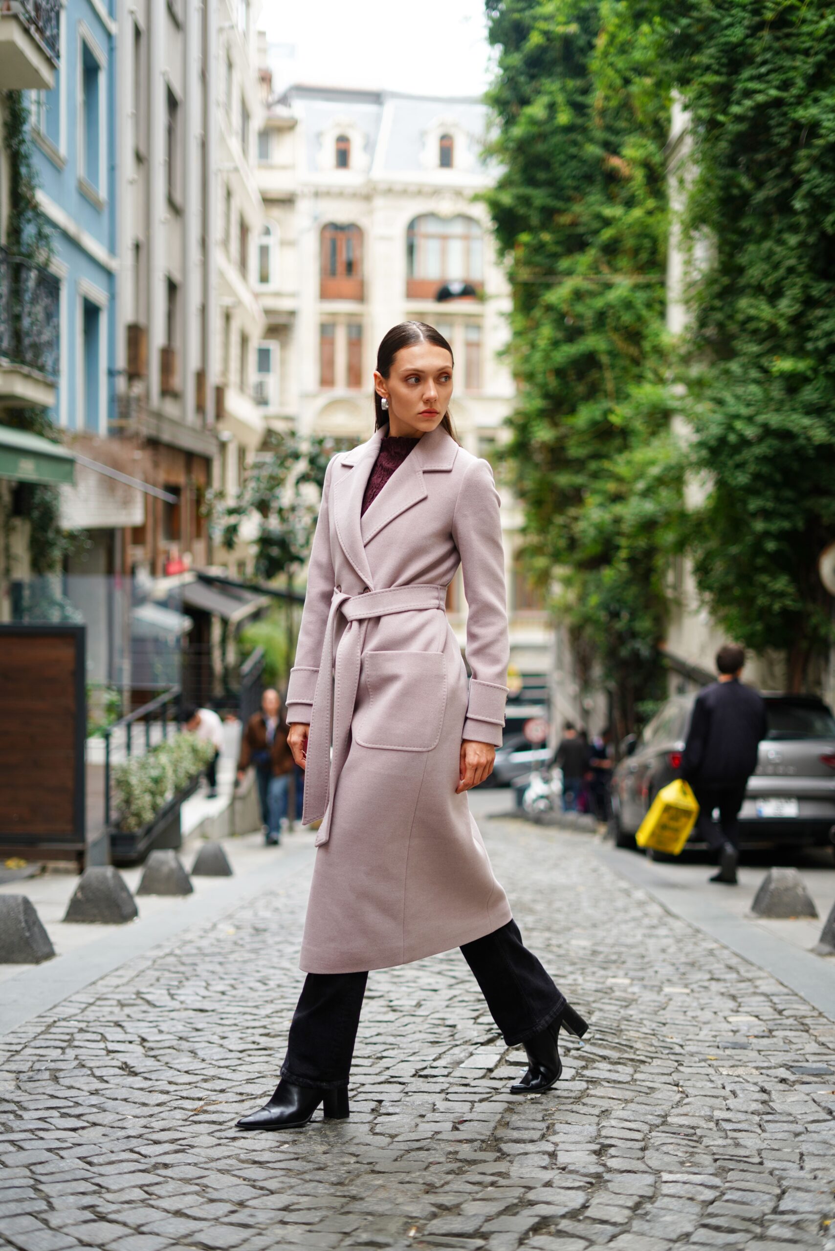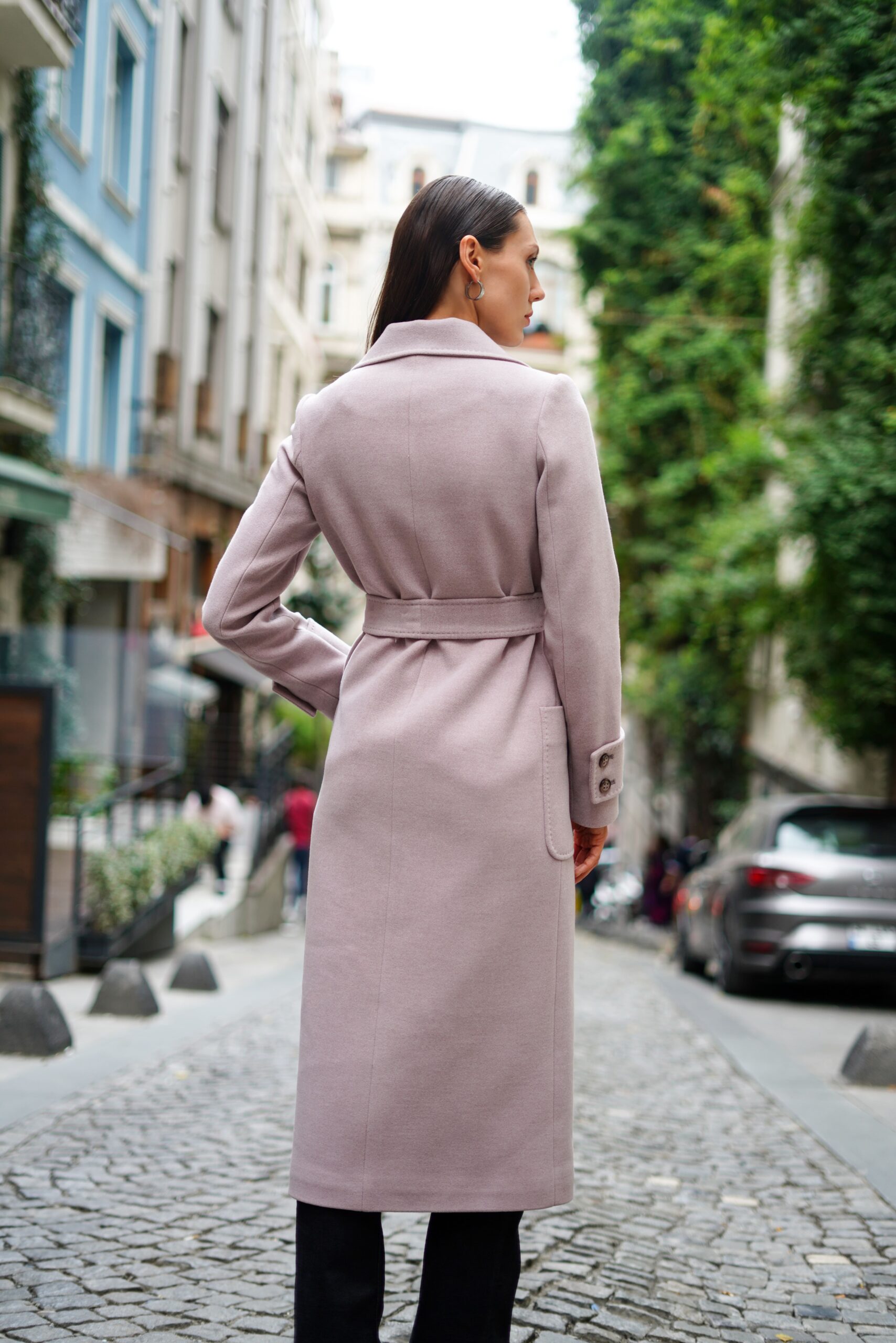 Long belted coat made from **100% cashmere fabric**. It offers a soft, elegant, and feminine look with its lilac shade. With its silk lining and comfortable fit, it provides both comfort and elegance throughout the winter. Suitable for every style, from daily city outfits to special occasions.