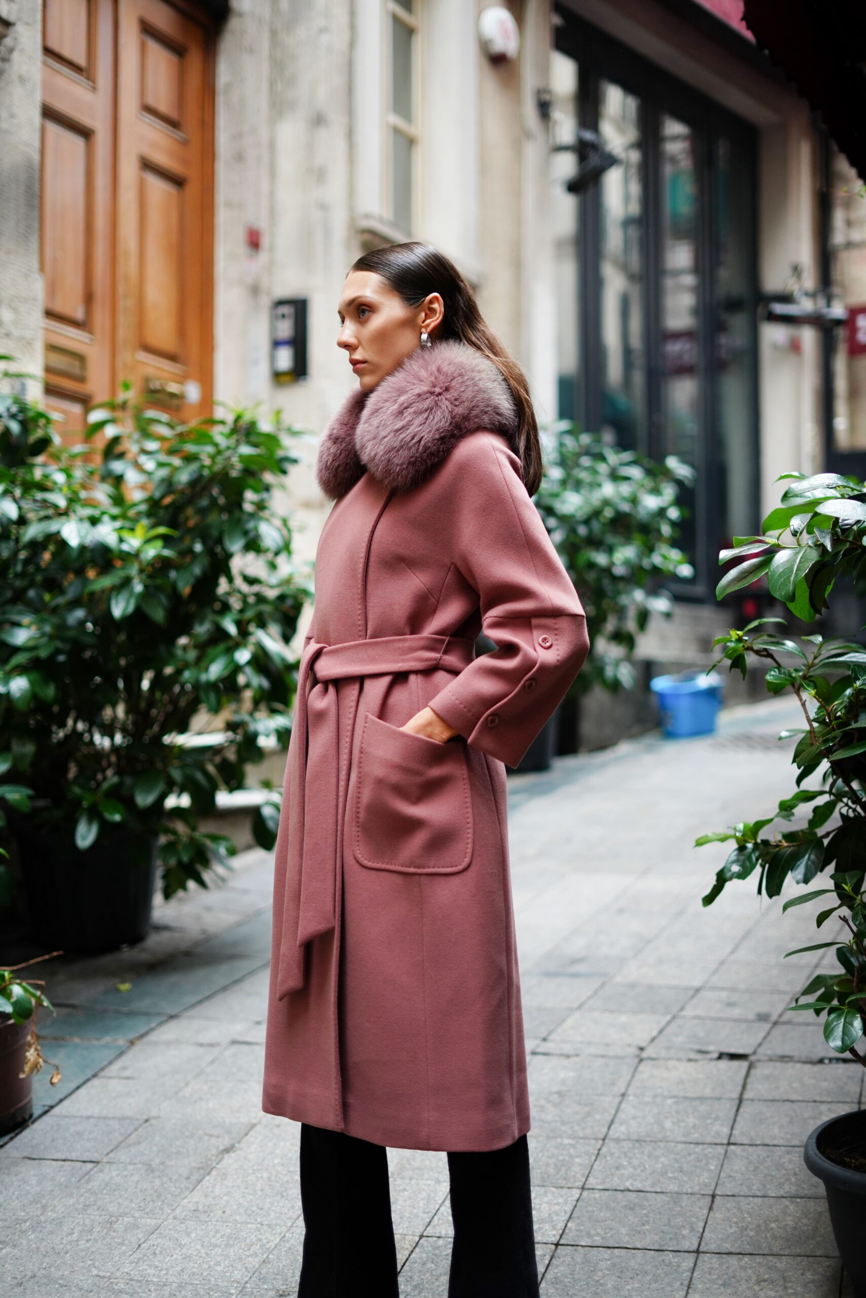The Jadem Cashmere coat stands out with couture elegance on city streets. Its dried rose shade, natural fur collar, and long belted cut redefine modern luxury.