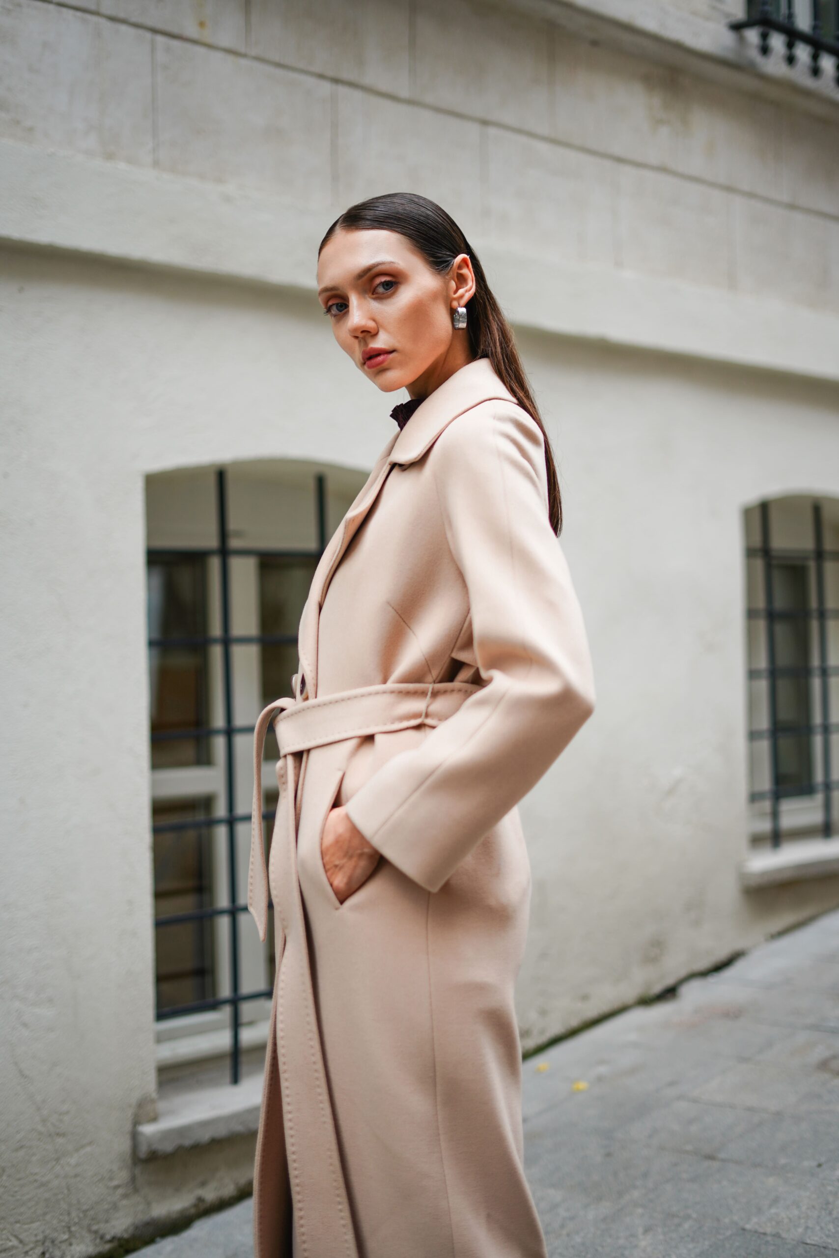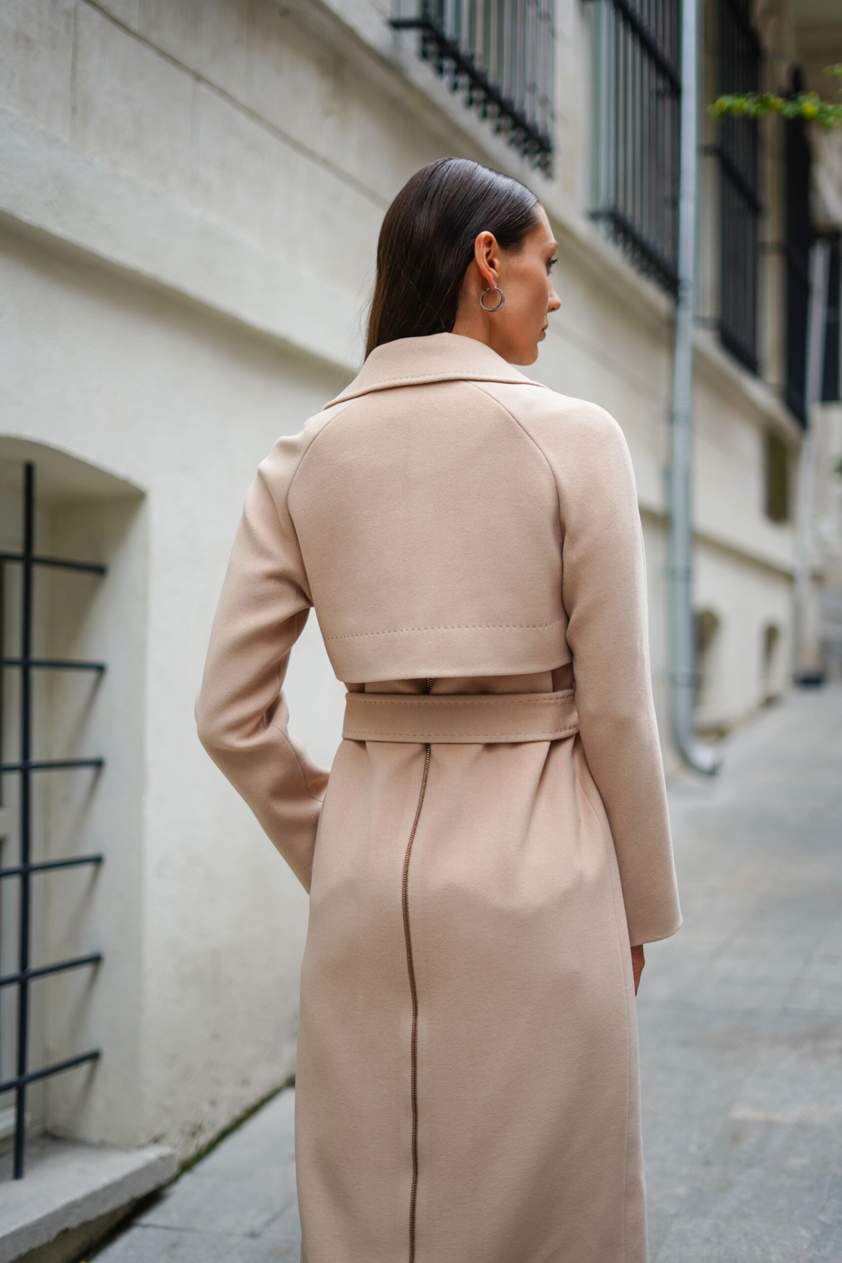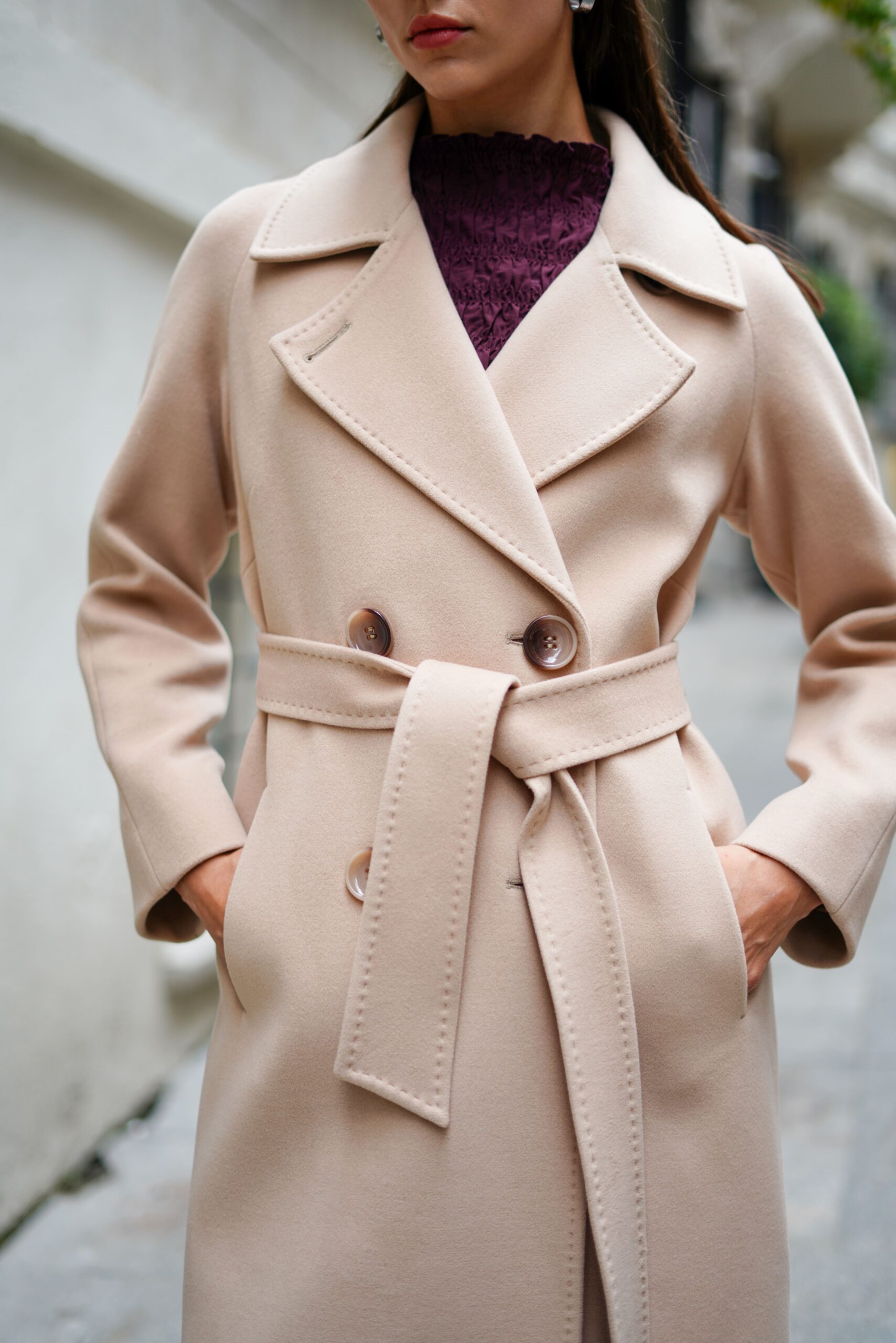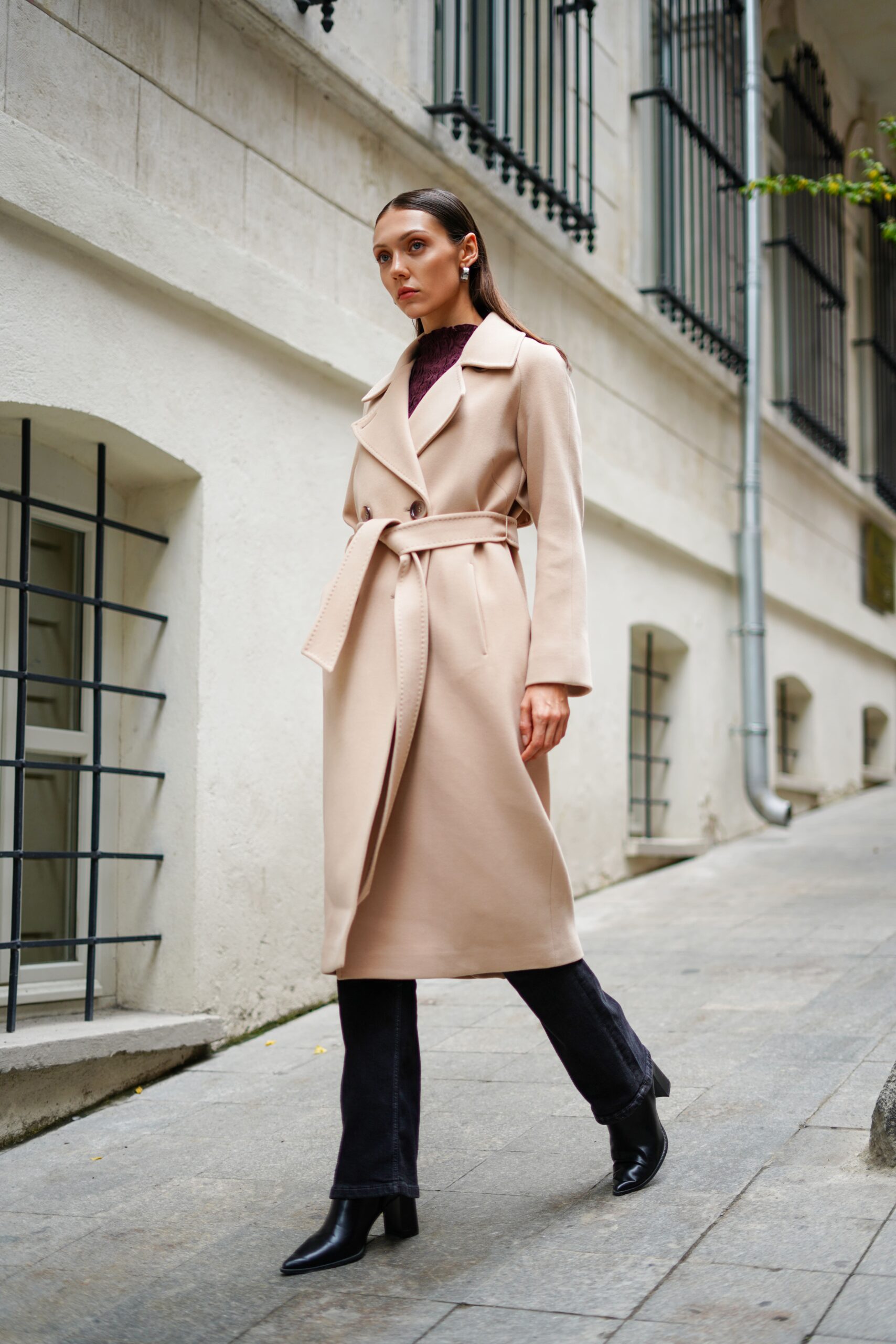 Длинное пальто с поясом из **100% кашемировой ткани**. Сочетает элегантность и простоту благодаря классическому бежевому оттенку.