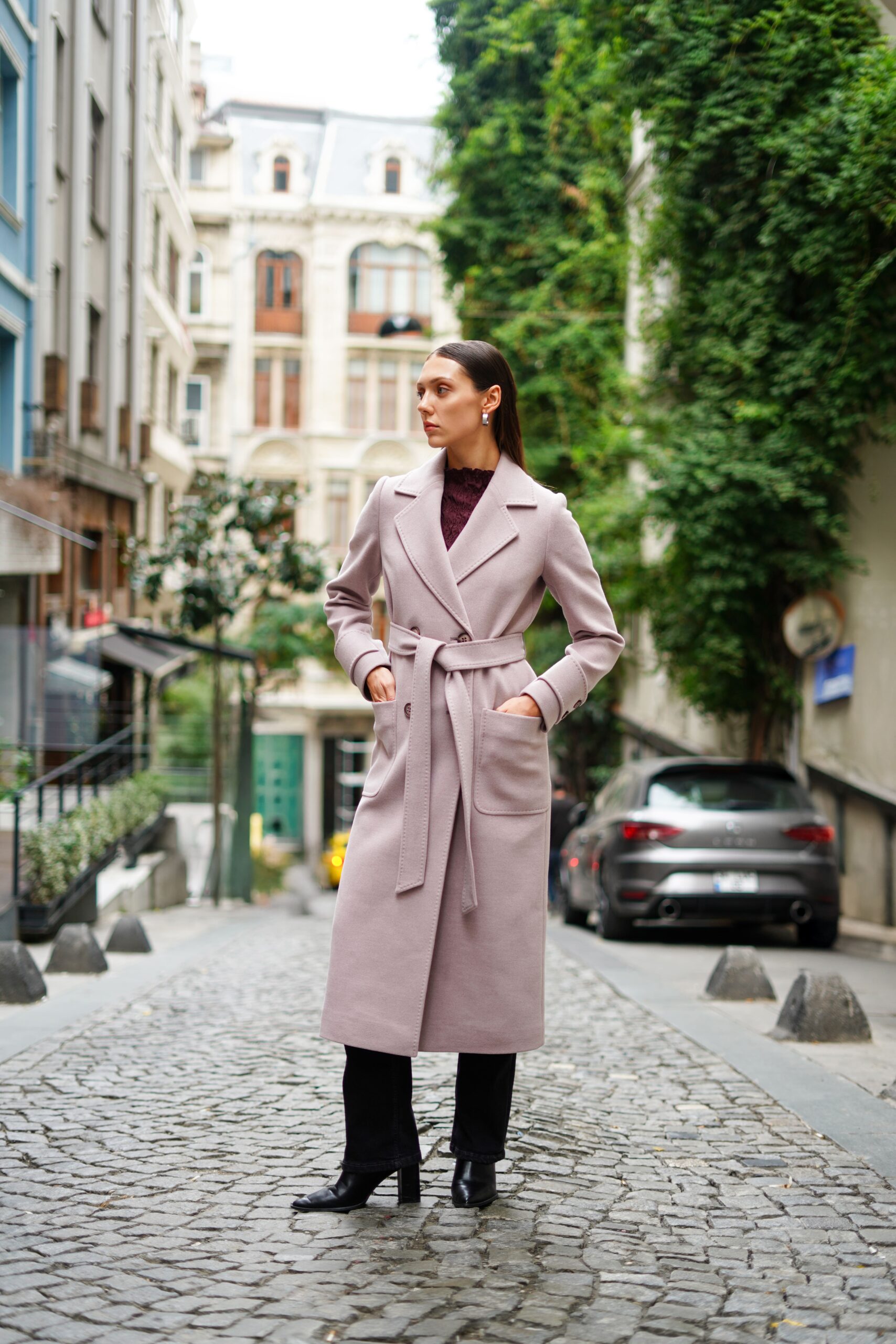 Длинное пальто с поясом из **100% кашемировой ткани**. Сиреневый оттенок придает ему мягкий, элегантный и женственный вид.