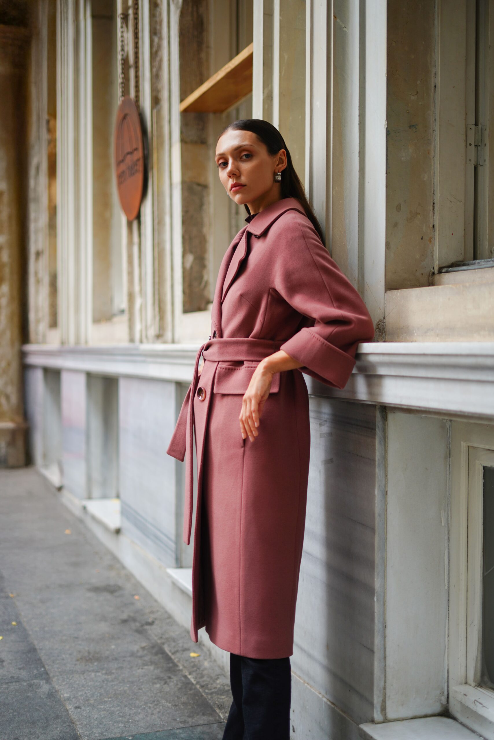 %100 kaşmir kumaştan üretilmiş uzun kuşaklı kaban. Gül kurusu tonuyla klasik şıklığı modern bir çizgide buluşturur. İpek astarı, yumuşak dokusu ve zarif kesimiyle hem sıcak hem konforludur. Günlük kullanıma ve özel gün kombinlerine uygundur.