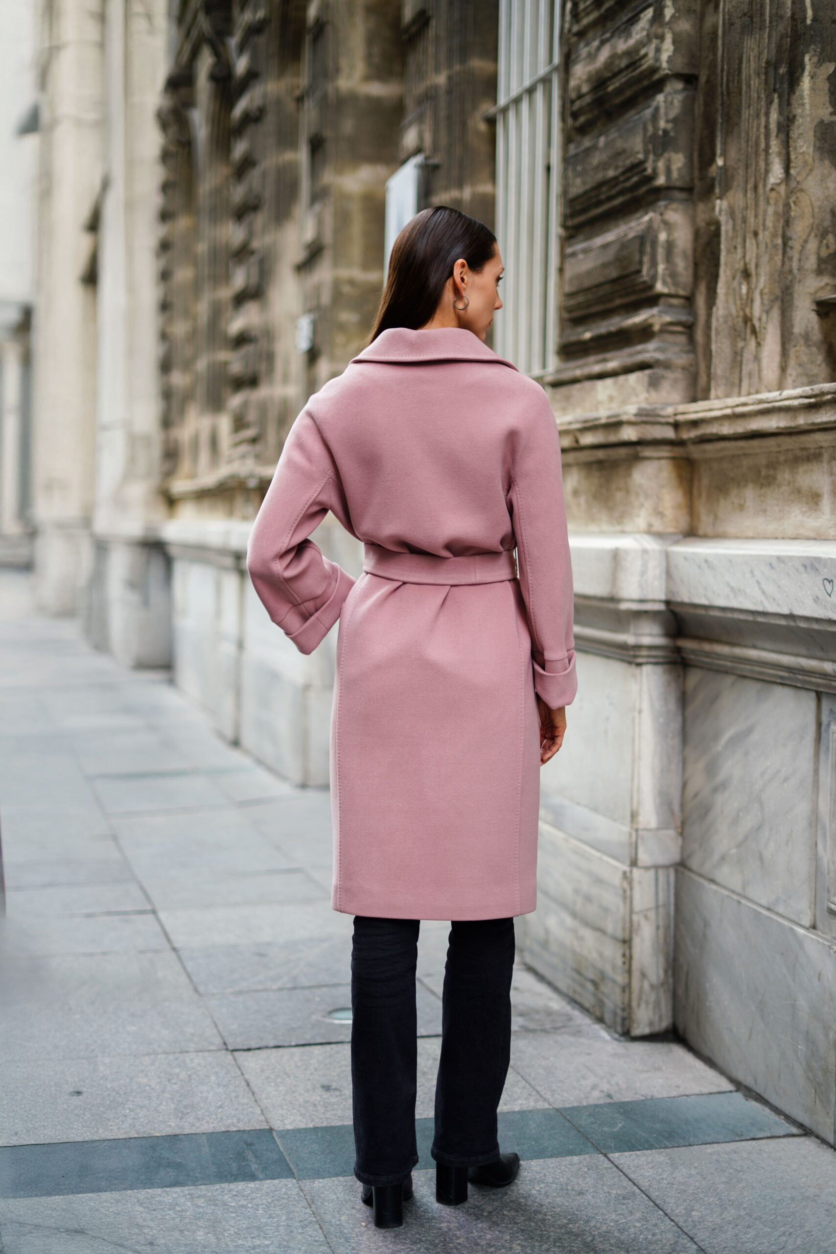 %100 kaşmir kumaştan üretilmiş bu uzun, çift düğmeli kemerli kaban; yumuşak dokusu,